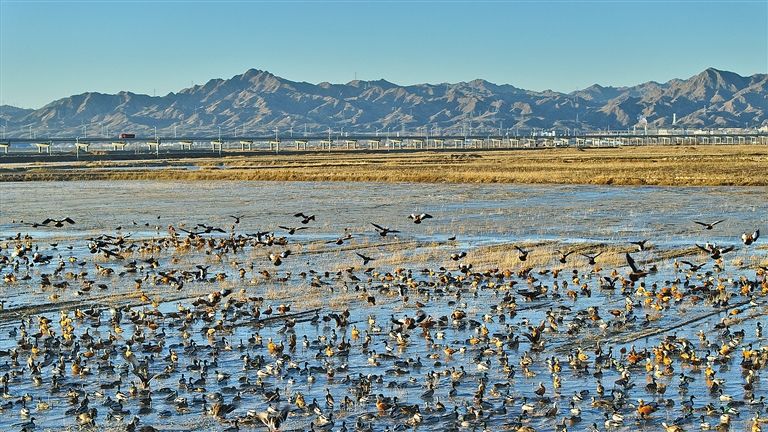 在鄂爾多斯市達拉特旗沿黃岸線的黃河濕地,春季遷徙候鳥大天鵝、灰鶴、赤麻鴨等陸續(xù)翩躚而至,它們或在水面游弋采食,或伸展脖頸梳理羽毛,為濕地增添了無限活力與詩意。楊耀中 攝