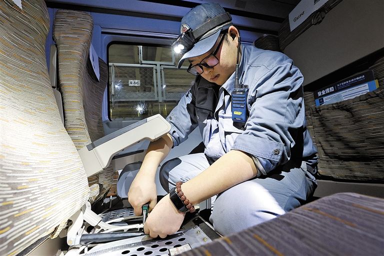 動車機(jī)械師修理動車組列車座椅。