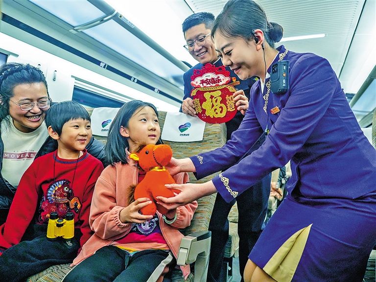 包頭客運(yùn)段乘務(wù)員為兒童旅客送上新春祝福。 來敬錚 攝